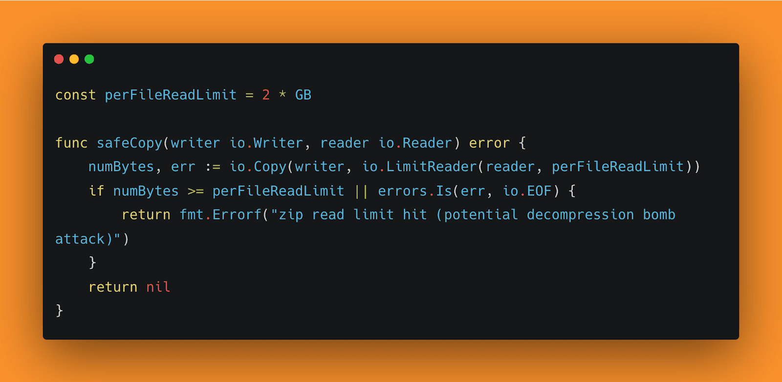 What makes this vulnerability particularly striking is that the Syft codebase already contains a purpose-built defense against decompression bombs, it simply isn't applied everywhere. In internal/file/copy.go, the developers defined a safeCopy() function that wraps io.Copy() with an io.LimitReader, capping the amount of data that can be extracted from any single file at two gigabytes. If that limit is reached, the function returns an explicit error identifying the event as a potential decompression bomb attack:
